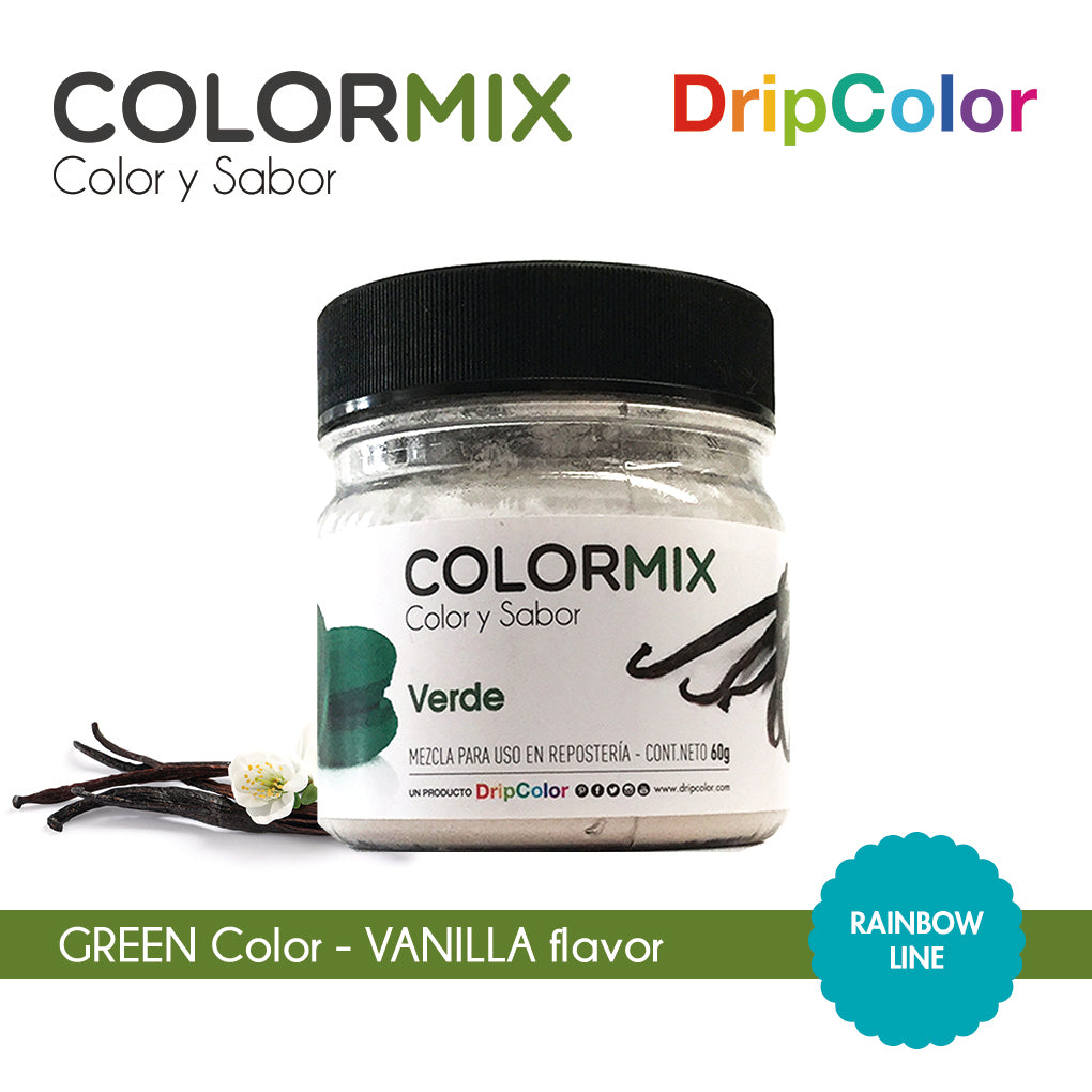 Color verde y sabor a vainilla Colorante en polvo 100% comestible. Dale un toque diferente a tus productos de panadería con ColorMix Rainbow. Esta línea incluye 6 colores diferentes con sabor a vainilla. Ideal para tortas, galletas, piononos, budines, merengues, macarons, cremas cocidas (crema pastelera, crema catalana, creme brulée) y más..!! Puedes usarlo en premezclas de postres y tortas. Cada bote contiene 60gr.