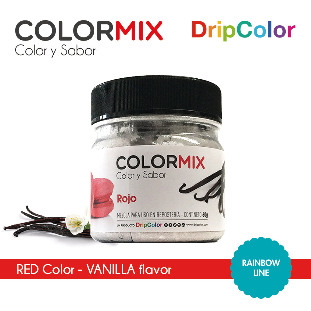 Color rojo y sabor a vainilla. Colorante en polvo 100% comestible. Dale un toque diferente a tus productos de panadería con ColorMix Rainbow. Esta línea incluye 6 colores diferentes con sabor a vainilla. Ideal para tortas, galletas, piononos, budines, merengues, macarons, cremas cocidas (crema pastelera, crema catalana, creme brulée) y más..!! Puedes usarlo en premezclas de postres y tortas. Cada bote contiene 60gr.