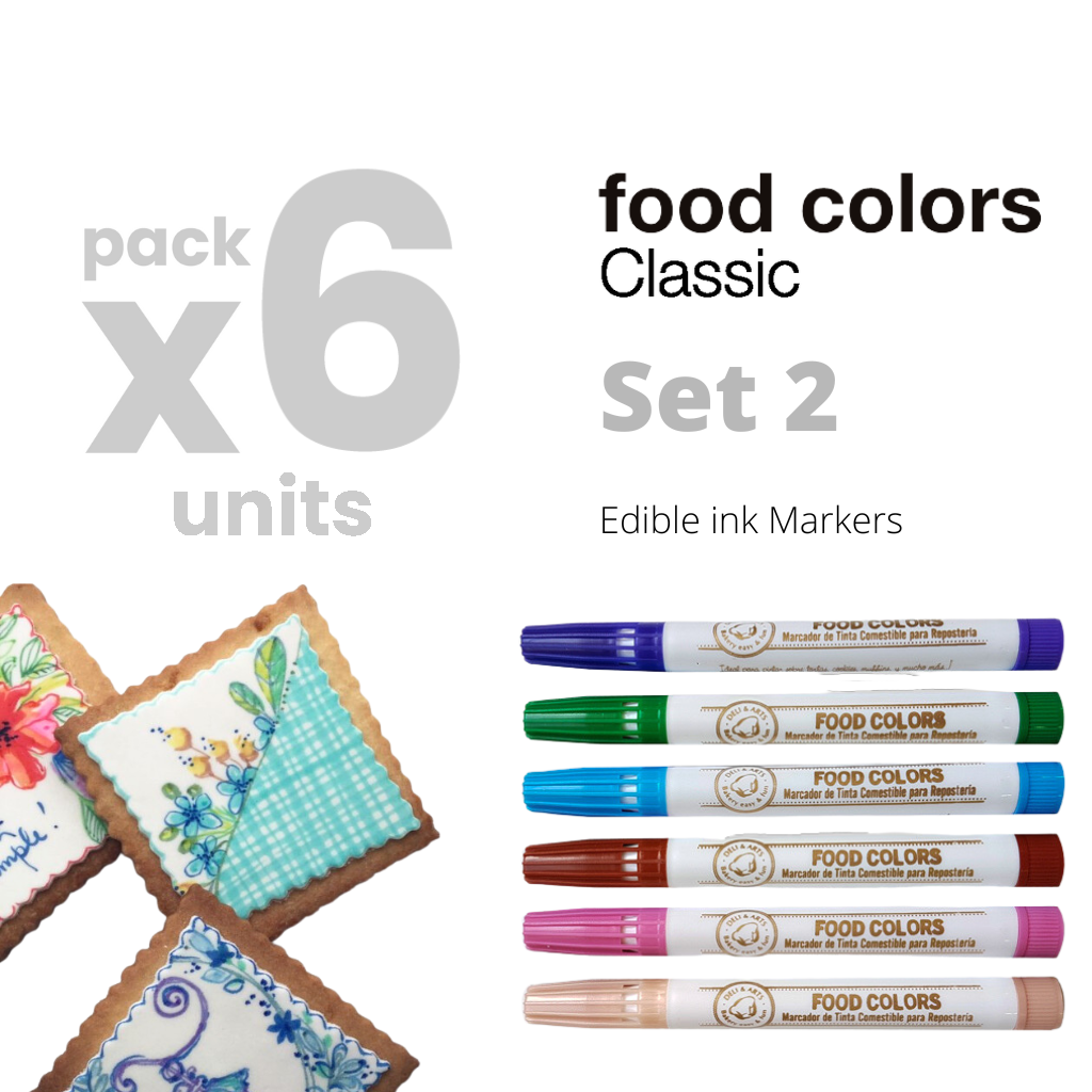 Rotuladores comestibles de color albaricoque, verde oscuro, rosa, violeta, azul claro y marrón. Punta cónica (trazos finos y gruesos).