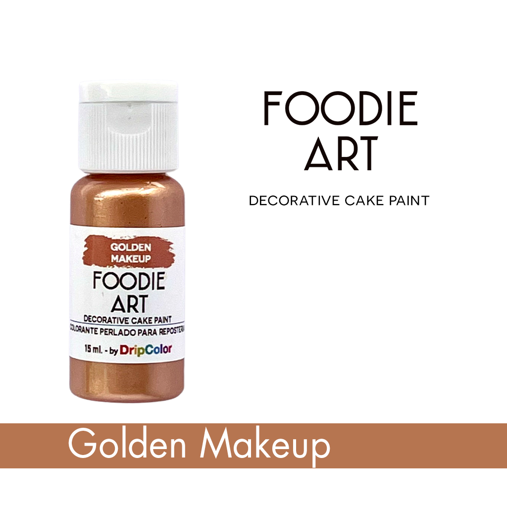 Maquillaje dorado cremoso y nacarado Color NO TÓXICO. Este producto es ideal para pintar y dar efectos de brillo a las decoraciones hechas en fondant, crema de mantequilla con costra fría, galletas de azúcar, malvaviscos, confitería, ganache, chocolate para modelar, macarons, pasta de goma y más..! Cada botella de Foodie Art contiene 15 ml.