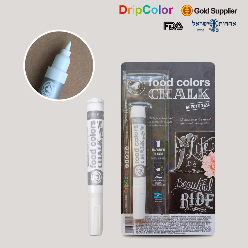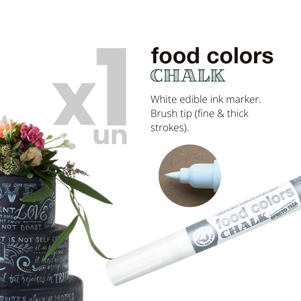Marcador comestible de color blanco. Punta de pincel (trazos finos y gruesos).
