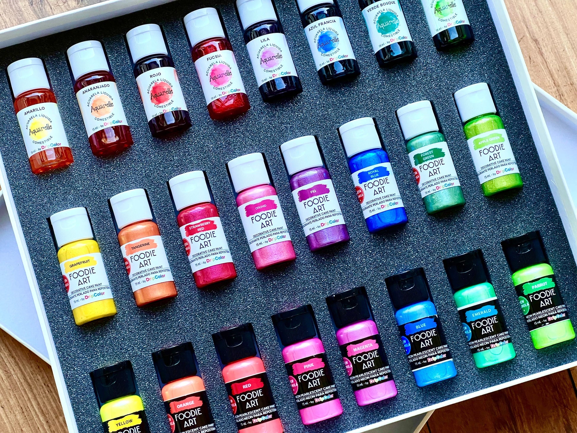 • 8 Tonos de Foodie Art, una línea de colores no tóxicos cremosos y neón nacarados “listos para aplicar”, ideal para pintar decoraciones de azúcar con pinceladas brillantes.