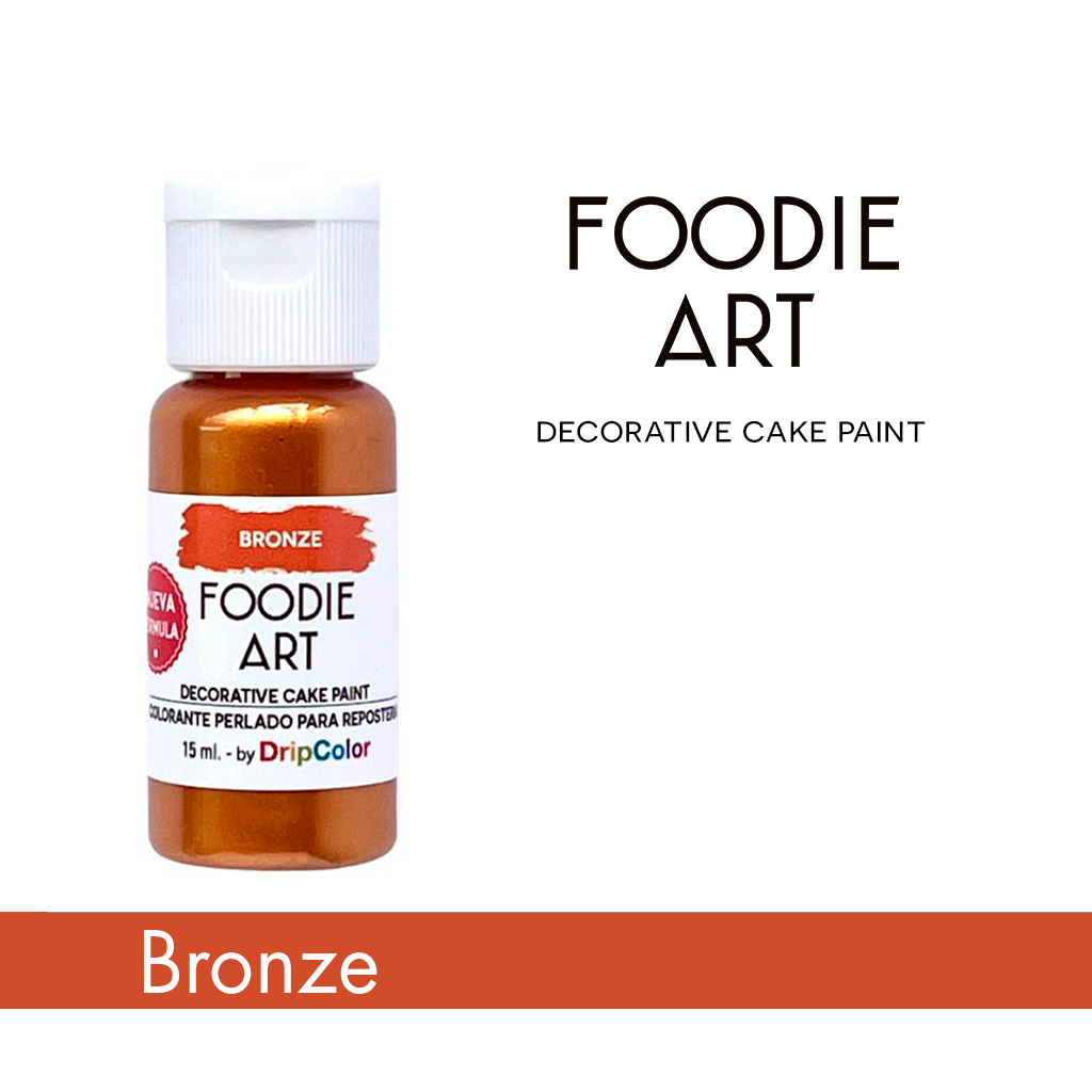 Color bronce cremoso y nacarado NO TÓXICO. Este producto es ideal para pintar y dar efectos de brillo a las decoraciones hechas en fondant, crema de mantequilla con costra fría, galletas de azúcar, malvaviscos, confitería, ganache, chocolate para modelar, macarons, pasta de goma y más..! Cada botella de Foodie Art contiene 15 ml.