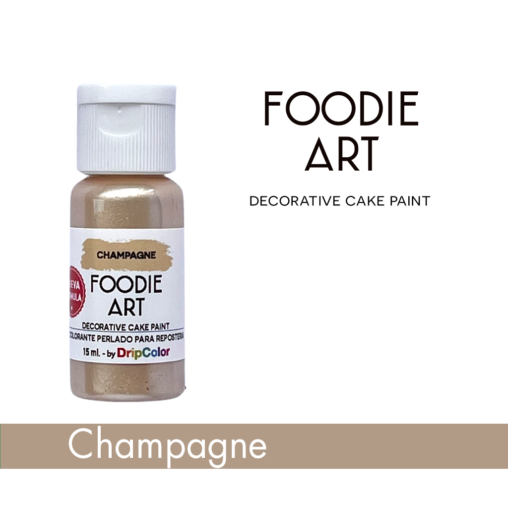 Champán cremoso y nacarado Color NO TÓXICO. Este producto es ideal para pintar y dar efectos de brillo a las decoraciones hechas en fondant, crema de mantequilla con costra fría, galletas de azúcar, malvaviscos, confitería, ganache, chocolate para modelar, macarons, pasta de goma y más..! Cada botella de Foodie Art contiene 15 ml.
