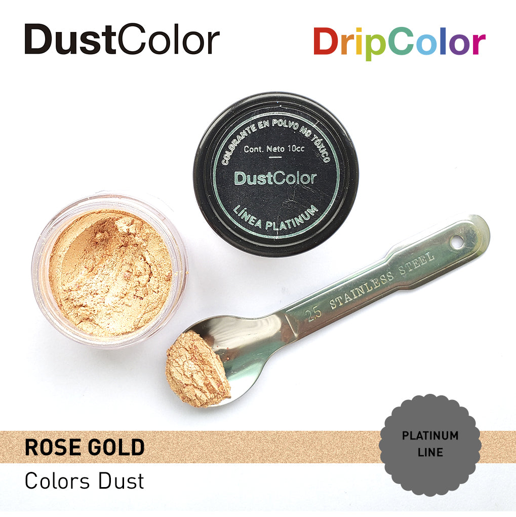 Colores oro rosa nacarados para manualidades. Producto NO TÓXICO ideal para la decoración de pasteles. Encuéntrate con una amplia gama de preparados que se beneficiarán de estos nuevos colorantes. Cada bote DustColor tiene 10cm3 de colorante.