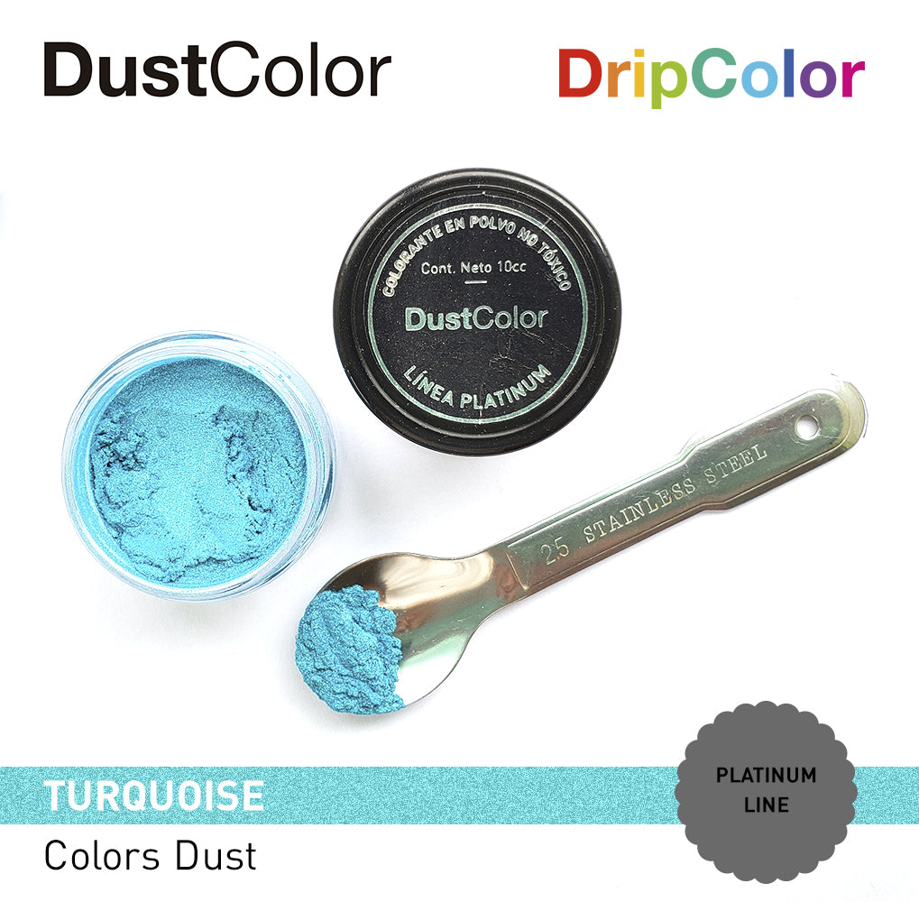 Colores turquesa nacarados para manualidades. Producto NO TÓXICO ideal para la decoración de pasteles. Encuéntrate con una amplia gama de preparados que se beneficiarán de estos nuevos colorantes. Cada bote DustColor tiene 10cm3 de colorante.
