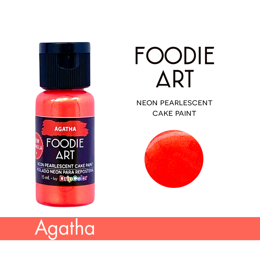 Agatha neón cremoso y nacarado Color NO TÓXICO. Este producto es ideal para pintar y dar efectos de brillo a las decoraciones hechas en fondant, crema de mantequilla con costra fría, galletas de azúcar, malvaviscos, confitería, ganache, chocolate para modelar, macarons, pasta de goma y más..! Cada botella de Foodie Art contiene 15 ml.