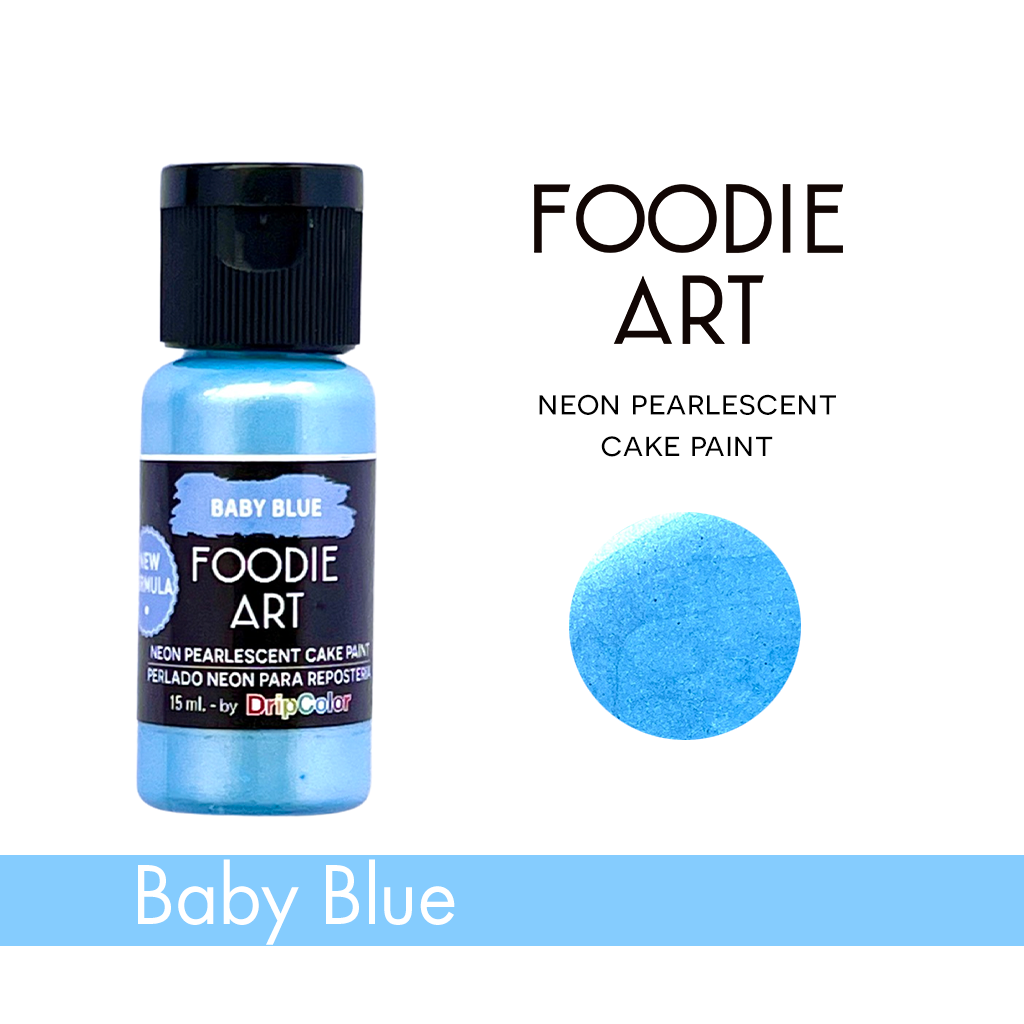 Color azul bebé neón cremoso y perlado NO TÓXICO. Este producto es ideal para pintar y dar efectos de brillo a las decoraciones hechas en fondant, crema de mantequilla con costra fría, galletas de azúcar, malvaviscos, confitería, ganache, chocolate para modelar, macarons, pasta de goma y más..! Cada botella de Foodie Art contiene 15 ml.