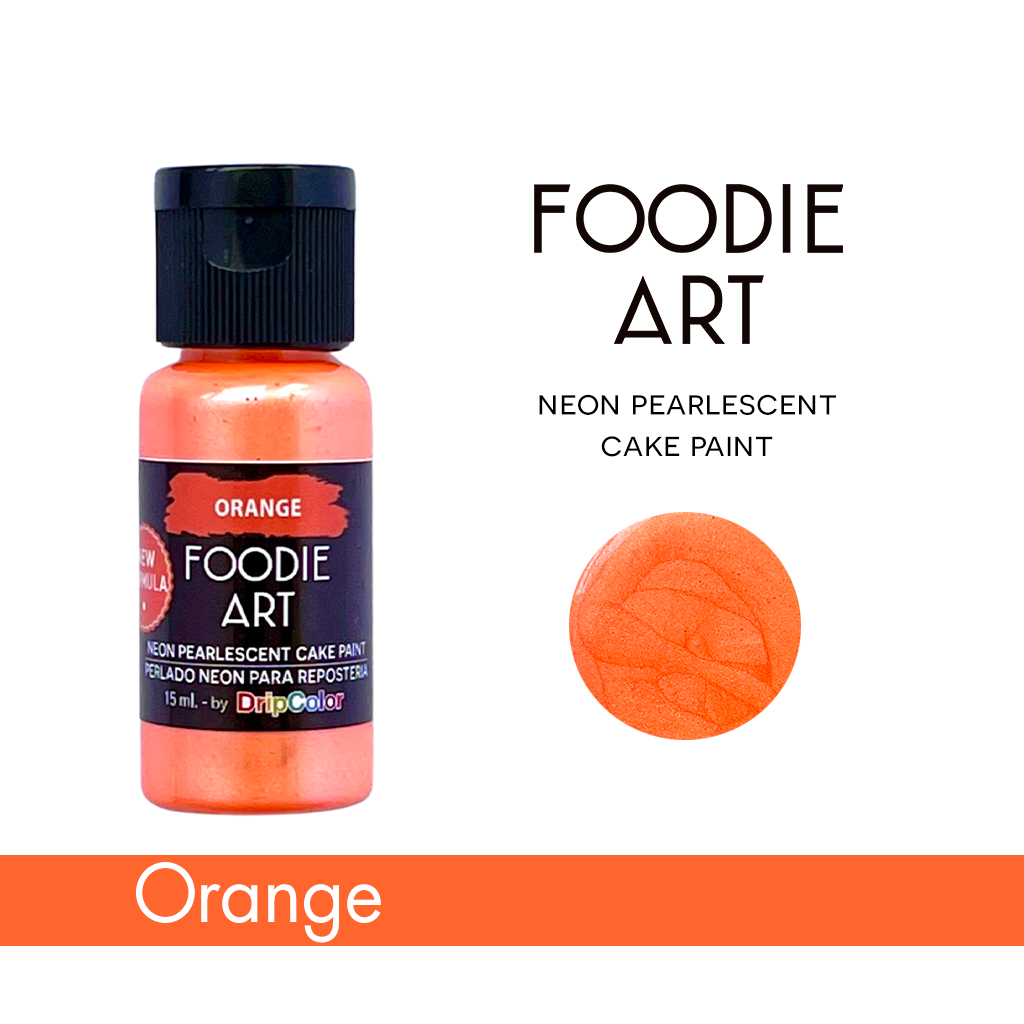 Color naranja neón cremoso y perlado NO TÓXICO. Este producto es ideal para pintar y dar efectos de brillo a las decoraciones hechas en fondant, crema de mantequilla con costra fría, galletas de azúcar, malvaviscos, confitería, ganache, chocolate para modelar, macarons, pasta de goma y más..! Cada botella de Foodie Art contiene 15 ml.