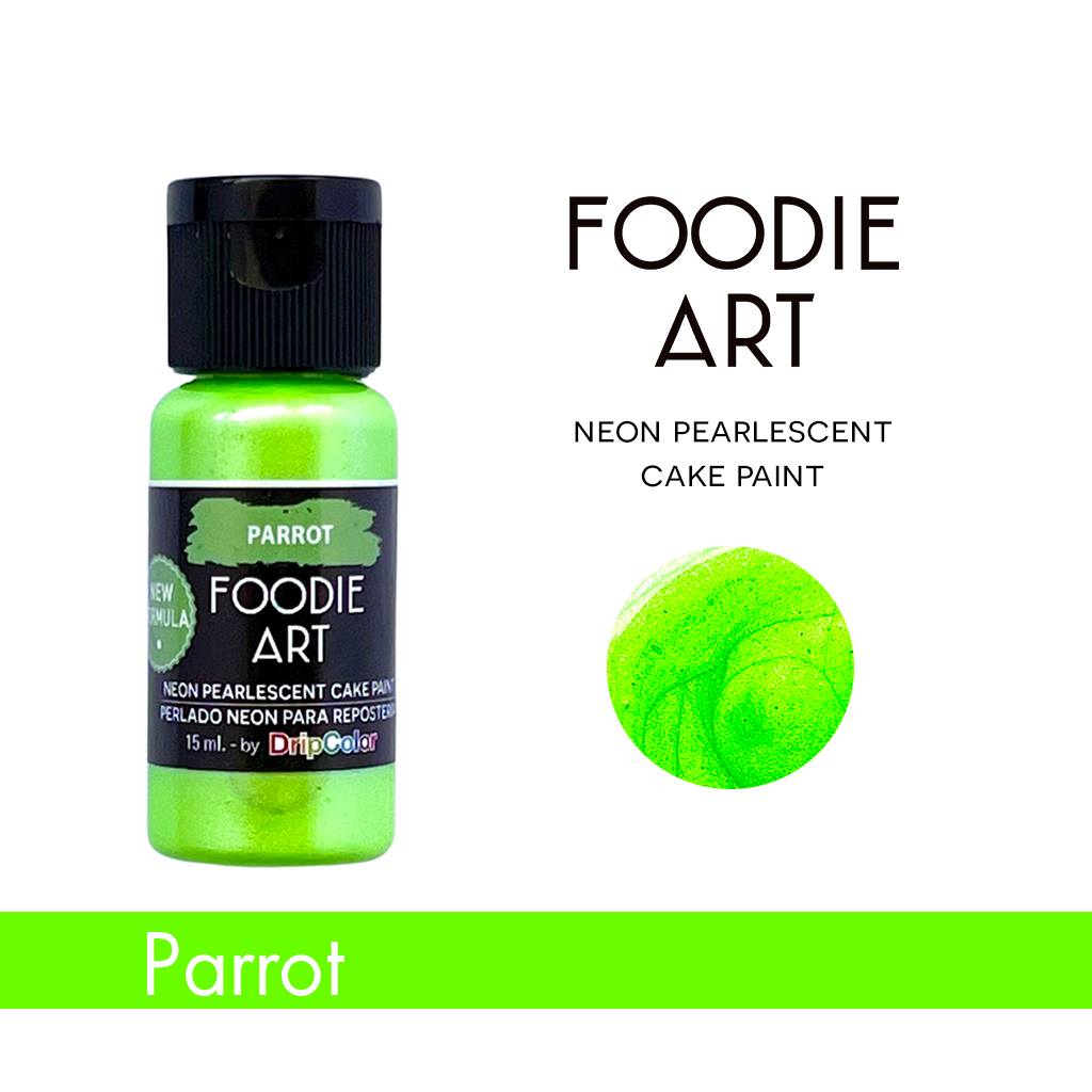 Loro de neón cremoso y perlado Color NO TÓXICO. Este producto es ideal para pintar y dar efectos de brillo a las decoraciones hechas en fondant, crema de mantequilla con costra fría, galletas de azúcar, malvaviscos, confitería, ganache, chocolate para modelar, macarons, pasta de goma y más..! Cada botella de Foodie Art contiene 15 ml.