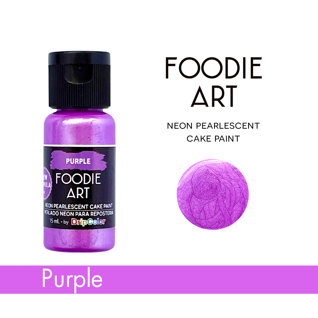 Color púrpura neón cremoso y perlado NO TÓXICO. Este producto es ideal para pintar y dar efectos de brillo a las decoraciones hechas en fondant, crema de mantequilla con costra fría, galletas de azúcar, malvaviscos, confitería, ganache, chocolate para modelar, macarons, pasta de goma y más..! Cada botella de Foodie Art contiene 15 ml.