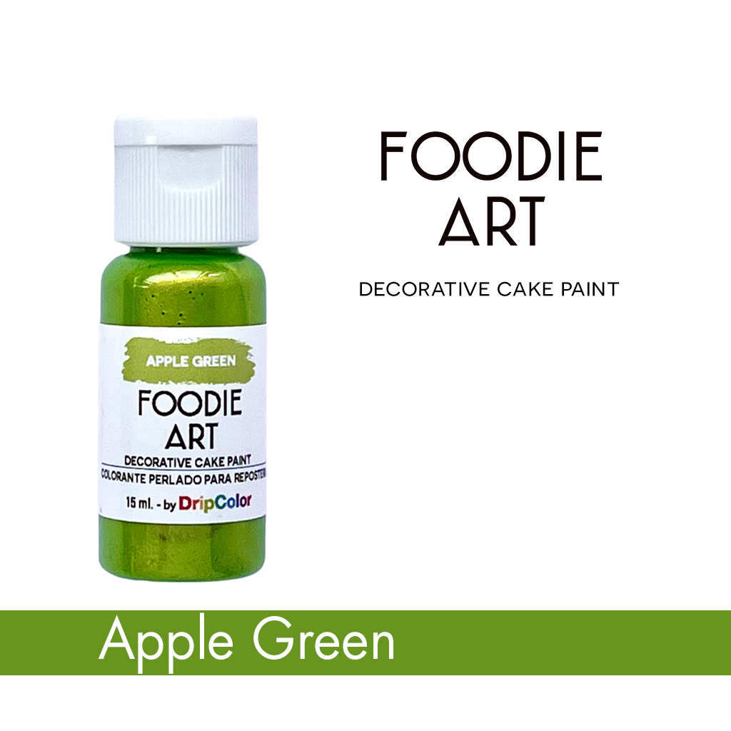 Color verde manzana cremoso y perlado NO TÓXICO. Este producto es ideal para pintar y dar efectos de brillo a las decoraciones hechas en fondant, crema de mantequilla con costra fría, galletas de azúcar, malvaviscos, confitería, ganache, chocolate para modelar, macarons, pasta de goma y más..! Cada botella de Foodie Art contiene 15 ml.