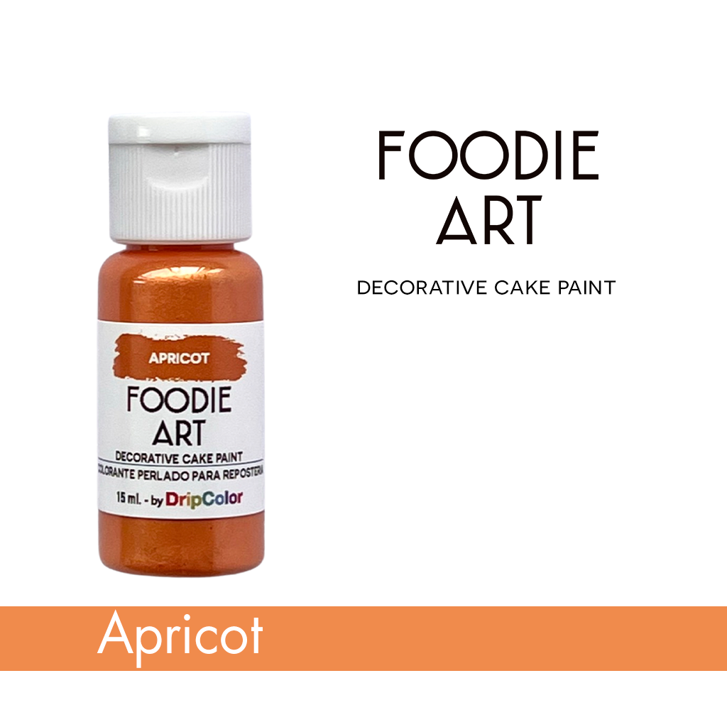 Color albaricoque cremoso y nacarado NO TÓXICO. Este producto es ideal para pintar y dar efectos de brillo a las decoraciones hechas en fondant, crema de mantequilla con costra fría, galletas de azúcar, malvaviscos, confitería, ganache, chocolate para modelar, macarons, pasta de goma y más..! Cada botella de Foodie Art contiene 15 ml.