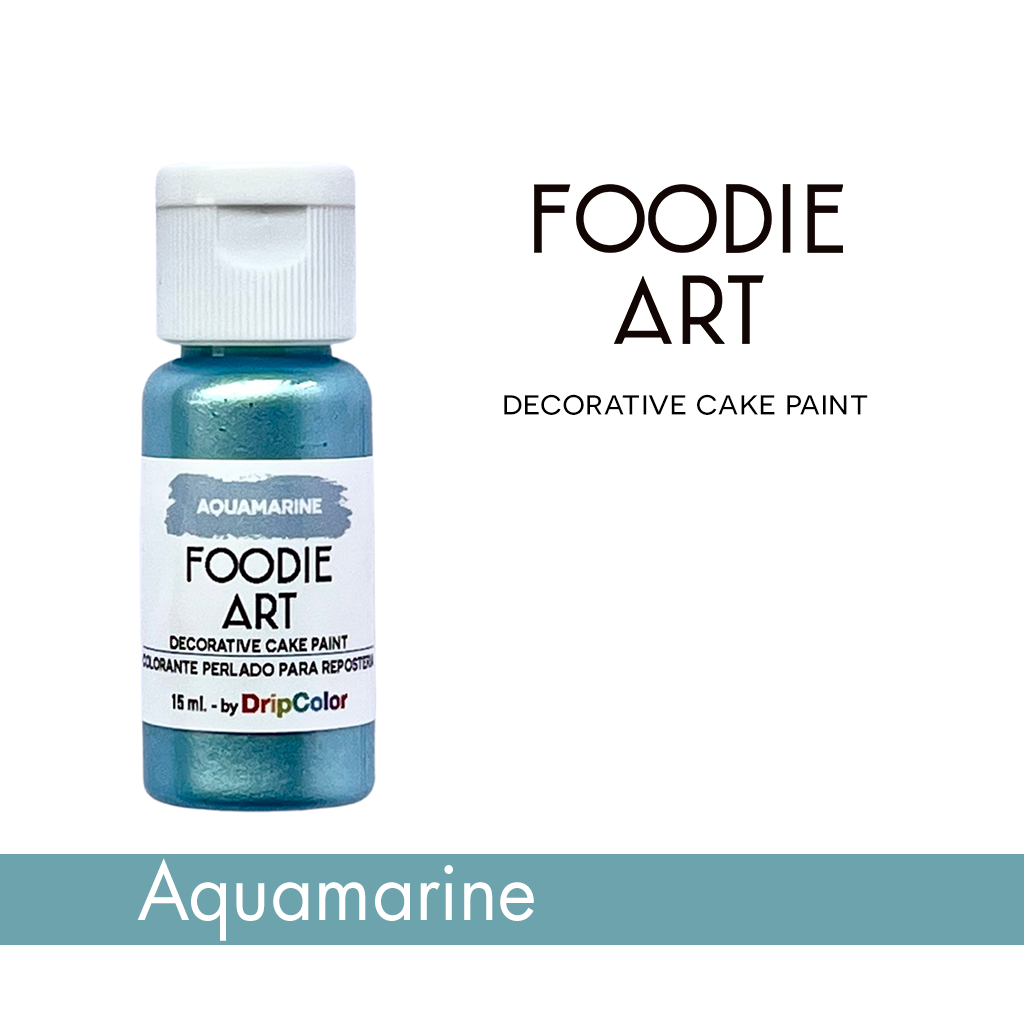 Color aguamarina cremoso y perlado NO TÓXICO. Este producto es ideal para pintar y dar efectos de brillo a las decoraciones hechas en fondant, crema de mantequilla con costra fría, galletas de azúcar, malvaviscos, confitería, ganache, chocolate para modelar, macarons, pasta de goma y más..! Cada botella de Foodie Art contiene 15 ml.