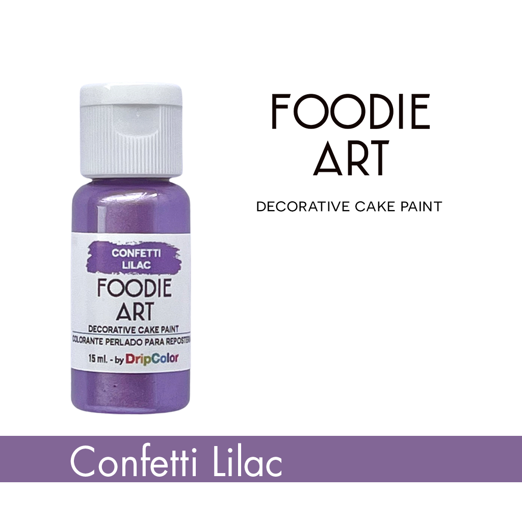 Confeti cremoso y perlado color lila NO TÓXICO. Este producto es ideal para pintar y dar efectos de brillo a las decoraciones hechas en fondant, crema de mantequilla con costra fría, galletas de azúcar, malvaviscos, confitería, ganache, chocolate para modelar, macarons, pasta de goma y más..! Cada botella de Foodie Art contiene 15 ml.