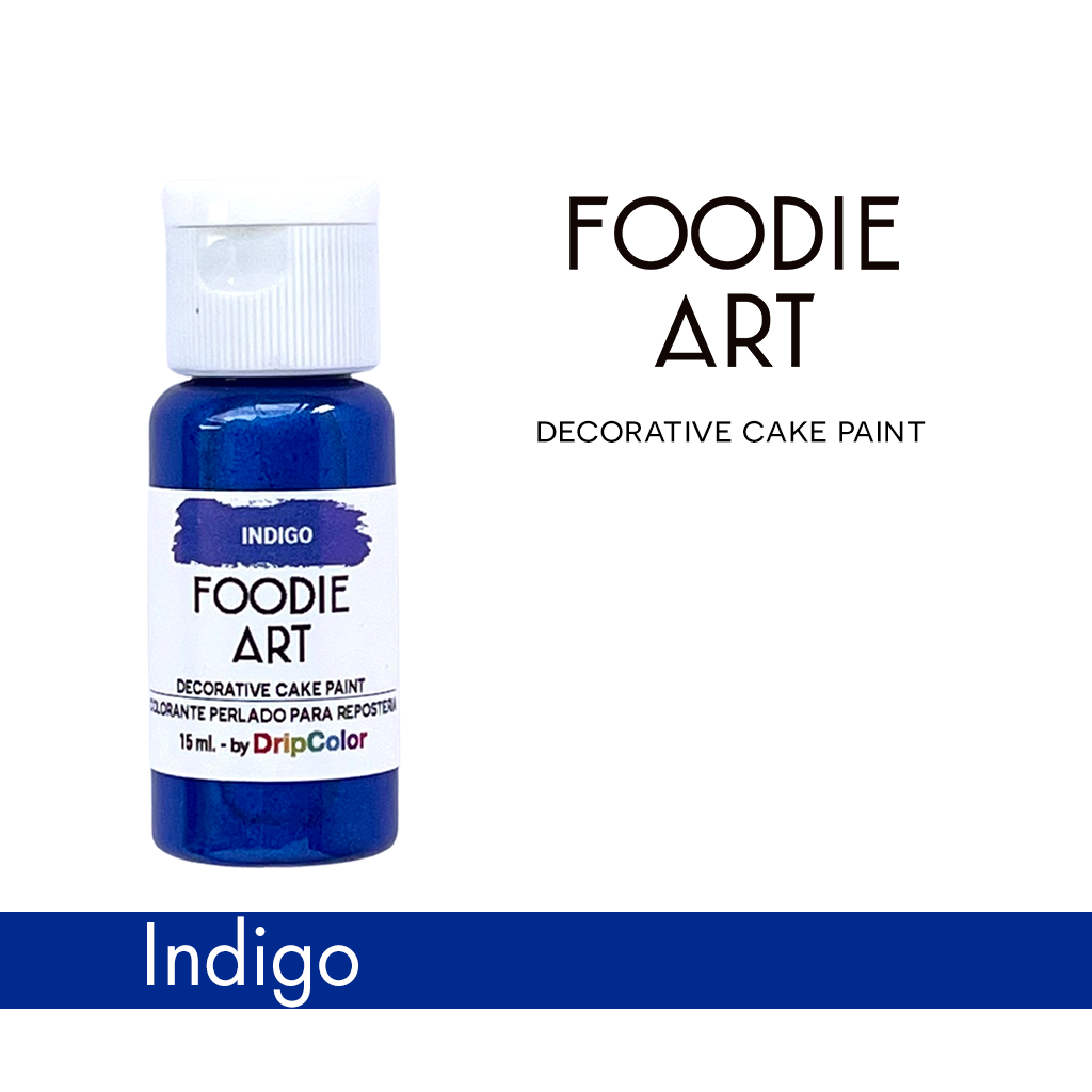 Color índigo cremoso y perlado NO TÓXICO. Este producto es ideal para pintar y dar efectos de brillo a las decoraciones hechas en fondant, crema de mantequilla con costra fría, galletas de azúcar, malvaviscos, confitería, ganache, chocolate para modelar, macarons, pasta de goma y más..! Cada botella de Foodie Art contiene 15 ml.
