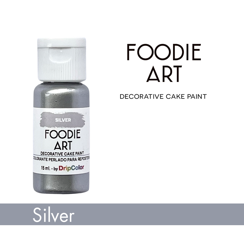 Color plata cremoso y nacarado NO TÓXICO. Este producto es ideal para pintar y dar efectos de brillo a las decoraciones hechas en fondant, crema de mantequilla con costra fría, galletas de azúcar, malvaviscos, confitería, ganache, chocolate para modelar, macarons, pasta de goma y más..! Cada botella de Foodie Art contiene 15 ml.