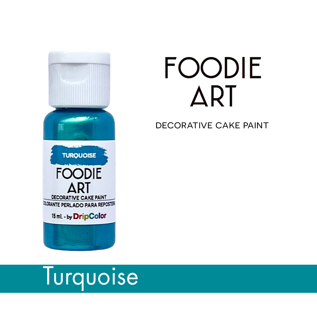 Color turquesa cremoso y nacarado NO TÓXICO. Este producto es ideal para pintar y dar efectos de brillo a las decoraciones hechas en fondant, crema de mantequilla con costra fría, galletas de azúcar, malvaviscos, confitería, ganache, chocolate para modelar, macarons, pasta de goma y más..! Cada botella de Foodie Art contiene 15 ml.